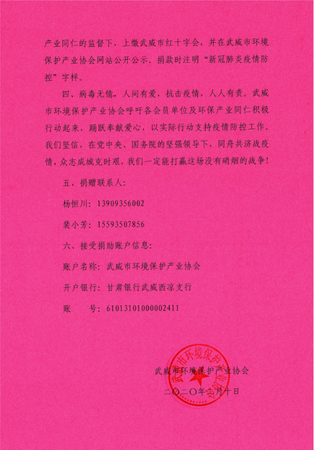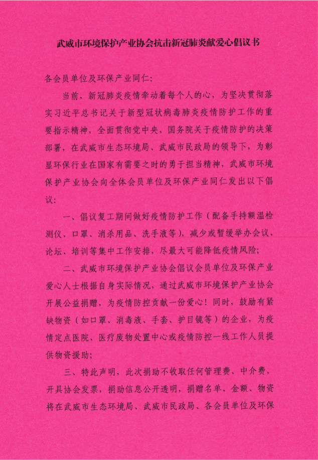 武威市環(huán)境保護產(chǎn)業(yè)協(xié)會抗擊新冠肺炎獻愛心倡議書